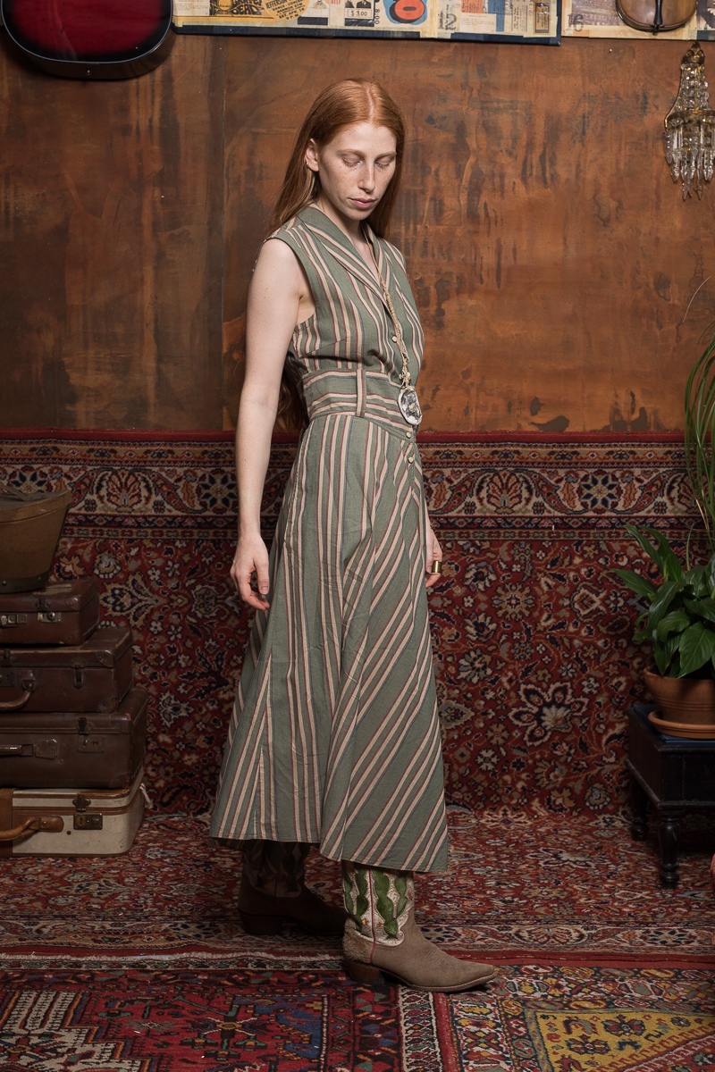 Sleeveless belted midi dress featuring a shawl collar and a fitted waist, elegantly cinched with a matching fabric belt. Designed with automatic mother-of-pearl buttons, two practical side pockets, and chambray inlays for added texture.