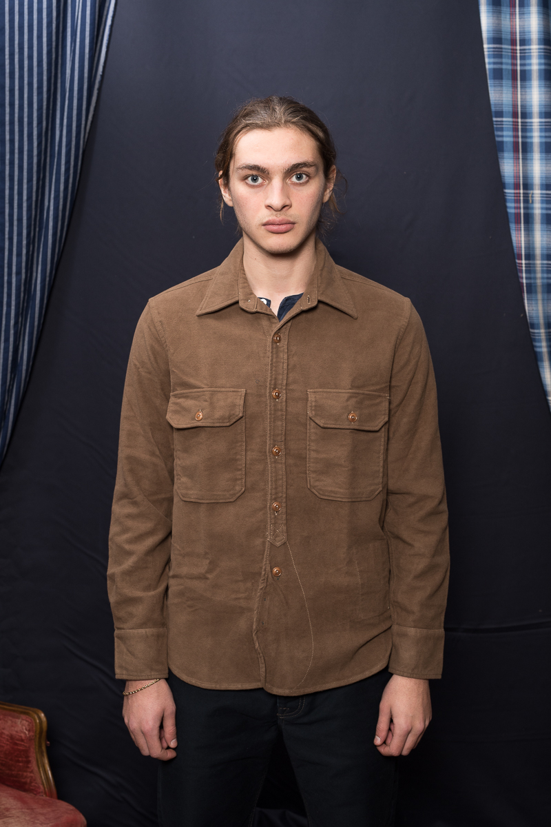 Camicia da lavoro con colletto a punta e due tasche applicate sul petto con apposito comparto per le propria penna. È rifinita con bottoni in corozo e orlo arrotondato.