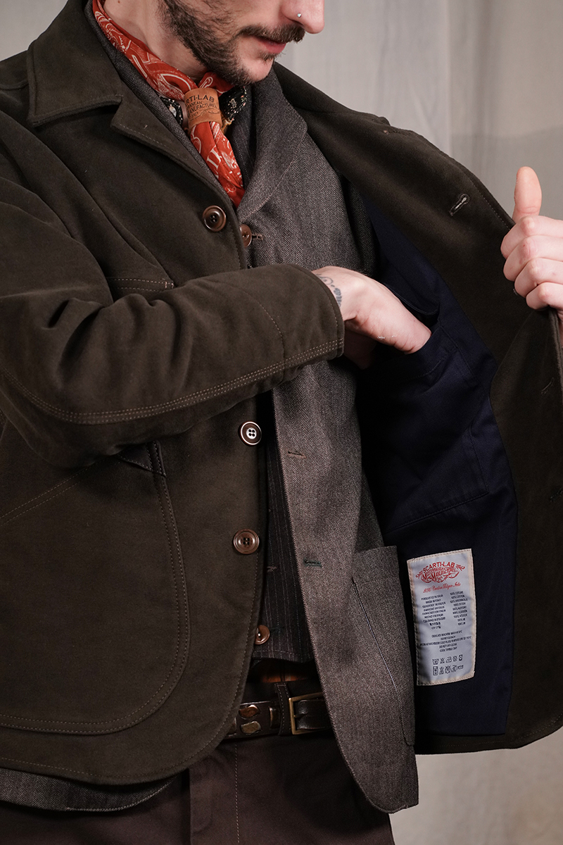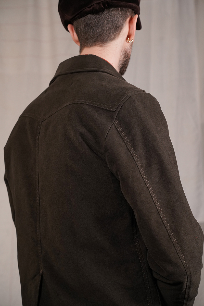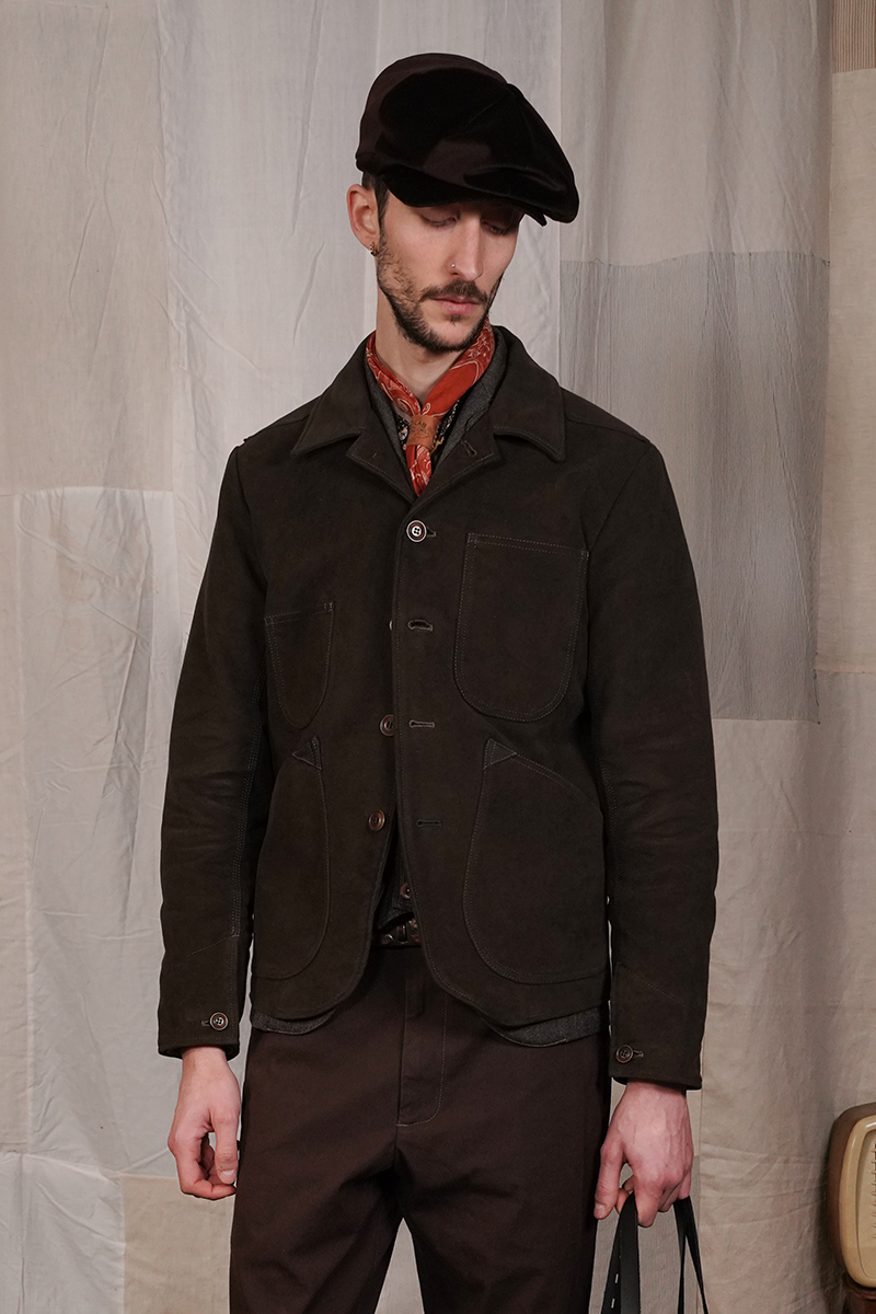 A single-breasted jacket with a balmacaan lapel and four buttons, it features two chest and two waist patch pockets, an interior right chest pocket, and a western back yoke. It is finished with corozo buttons and is fully lined.Designed and produced in Italy