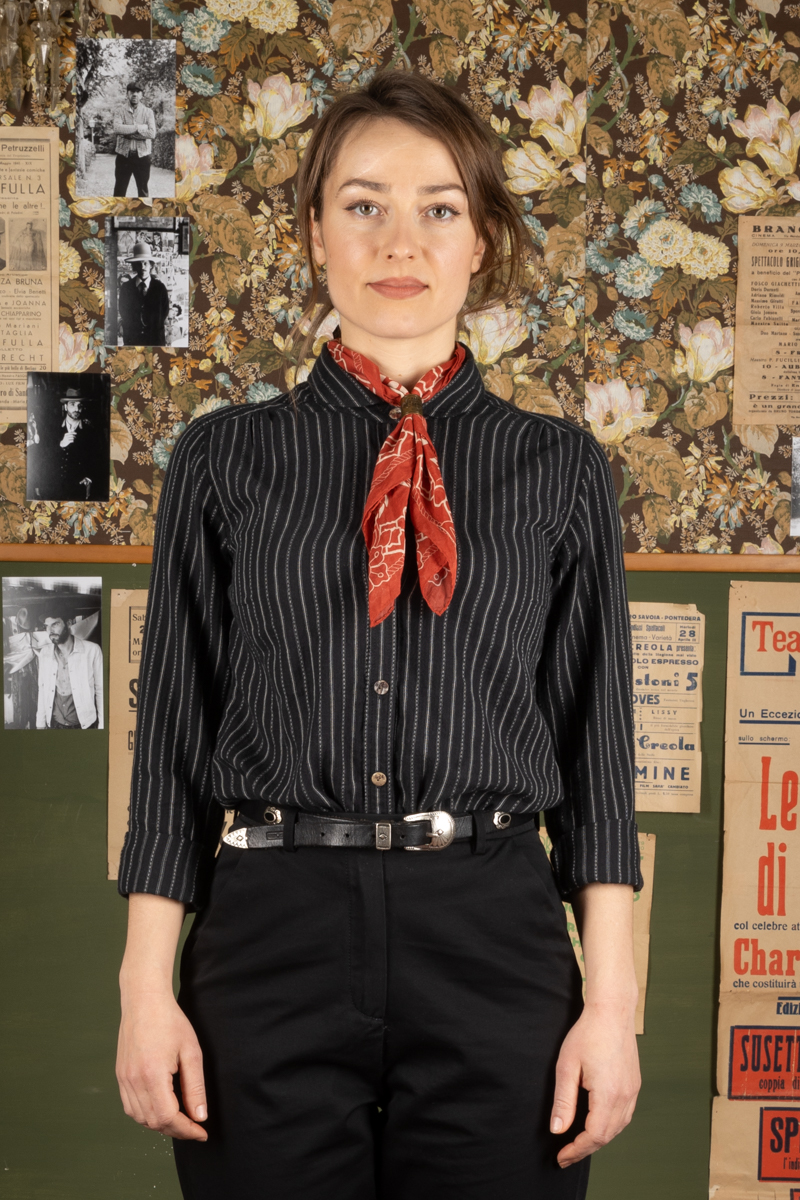 Round collar shirt with one left chest pocket and rounded hem. Finished with mother of pearl buttons and chambray inlays.